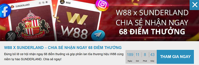 Cách nhận 68 điểm thưởng khi chia sẻ W88 x SUNDERLAND