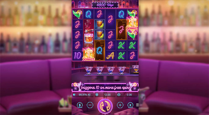 Đêm tiệc Cocktail slot được đặt trong không gian quầy bar hiện đại, có ánh đèn neon, âm nhạc và nhiều biểu tượng cùng chủ đề.