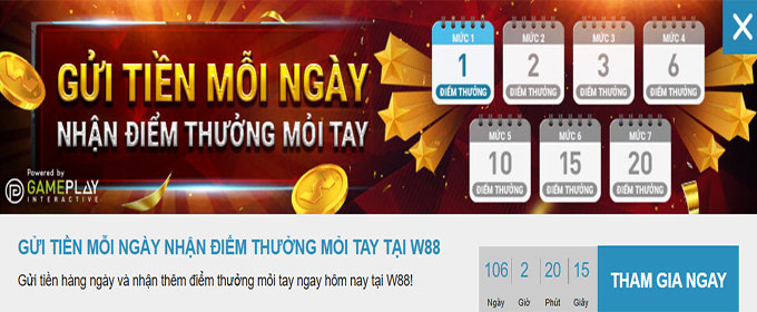 Tùy vào từng thời điểm và điều kiện khác nhau, nhà cái W88 sẽ đưa ra chương trình khuyến mãi gửi tiền cho thành viên. Vào mùa hè thu này, chỉ cần thành viên hoàn thành số tiền gửi mỗi ngày.